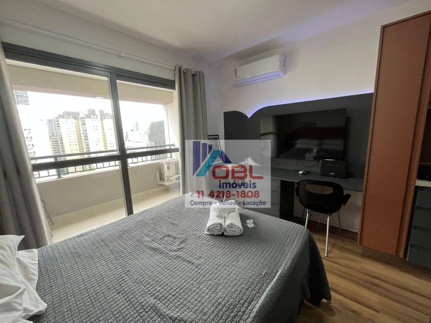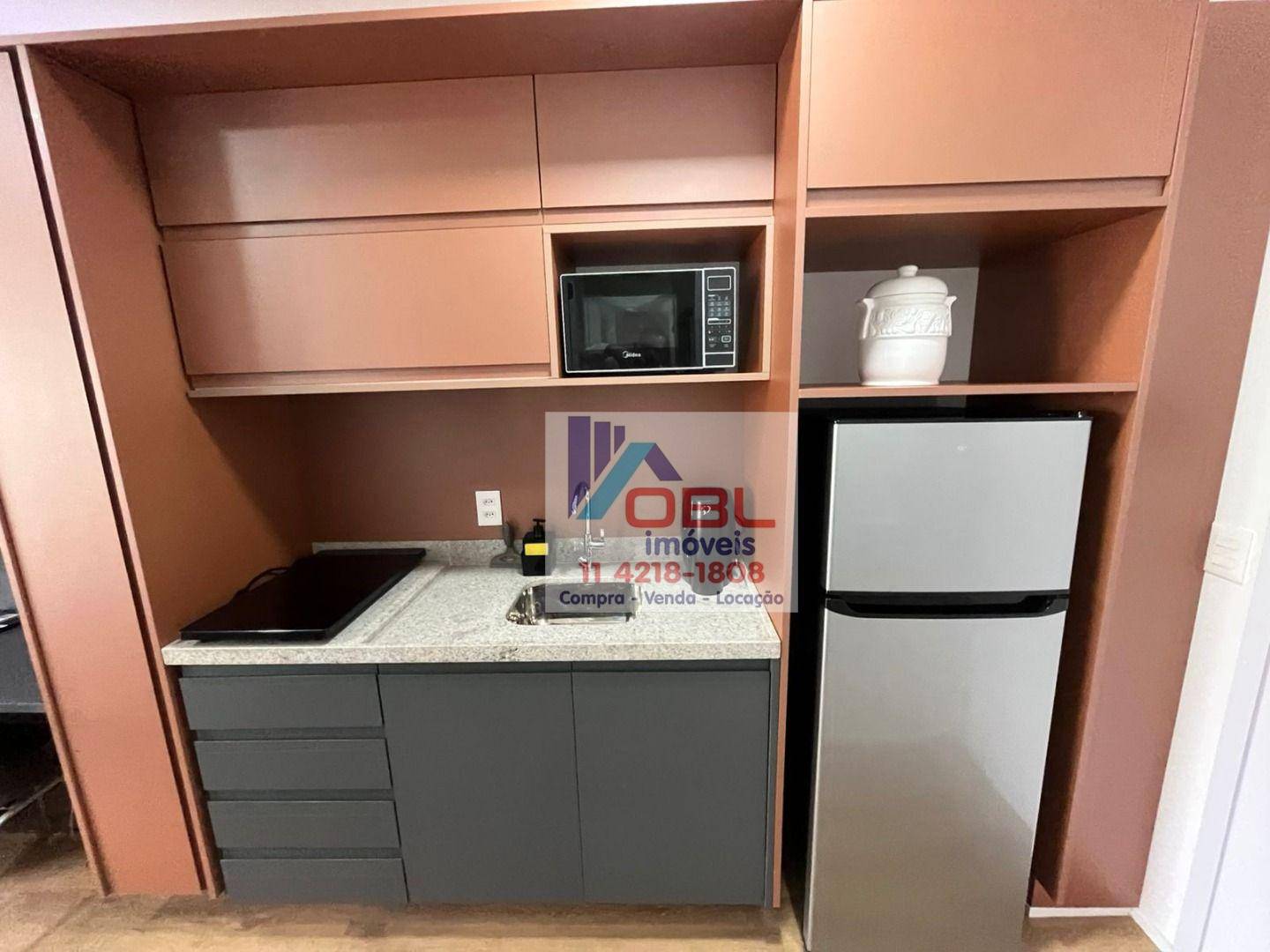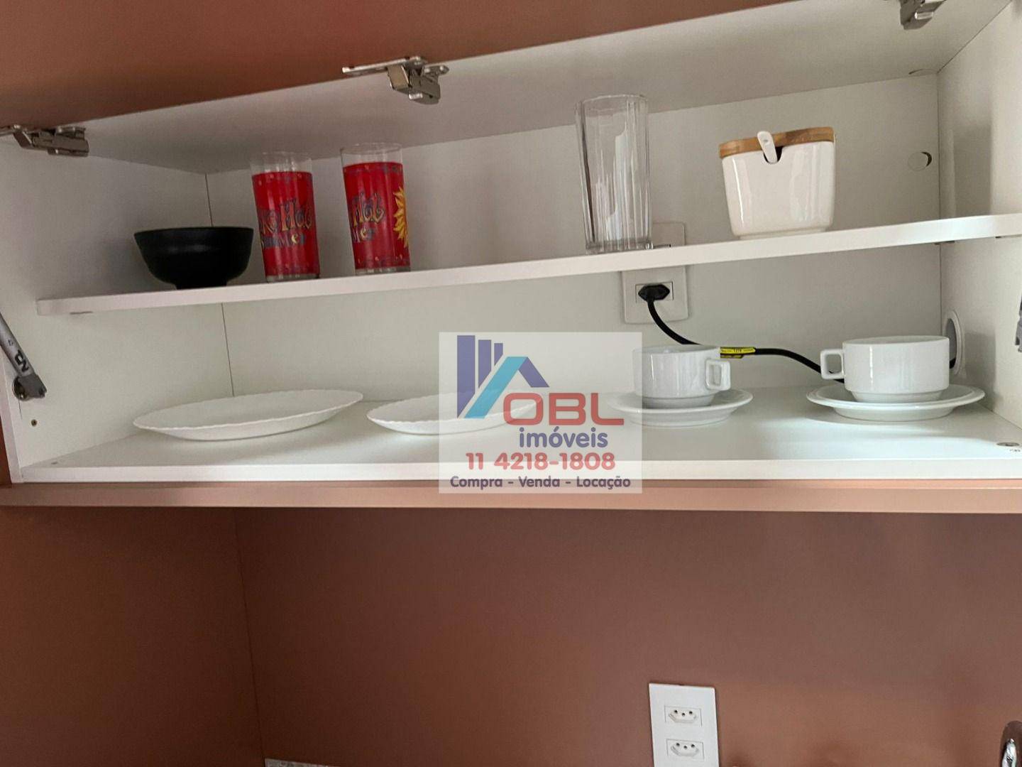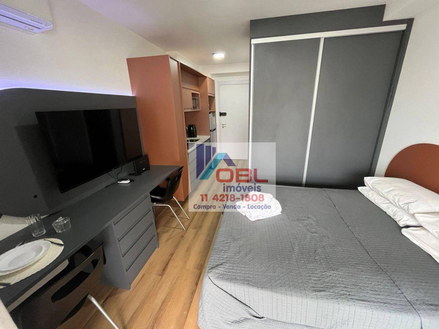 Armário cozinha, geladeira, fogão indução 02 bocas, micro ondas, tv, ar condicionado, pratos, talheres, panelas, copos, cama box, guarda roupa embutido.